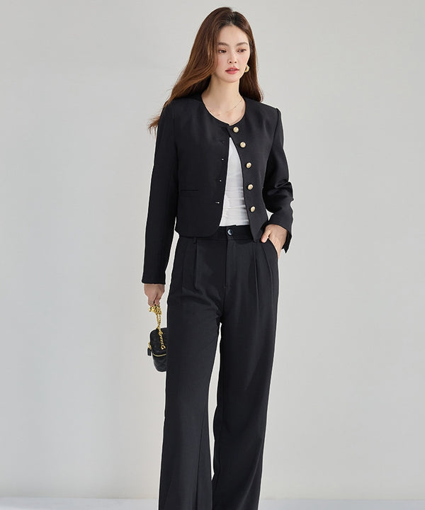 ブラックのノーカラーショートジャケットは、きちんと感と洗練された印象を兼ね備えた大人のオフィス定番アイテム。ゴールドボタンがさりげなく華やかさを添え、同じくブラックのボトムスと合わせれば統一感のある上品なワントーンコーデに。シンプルながらもディテールで差をつけることで、日常のオフィススタイルがぐっと格上げ。