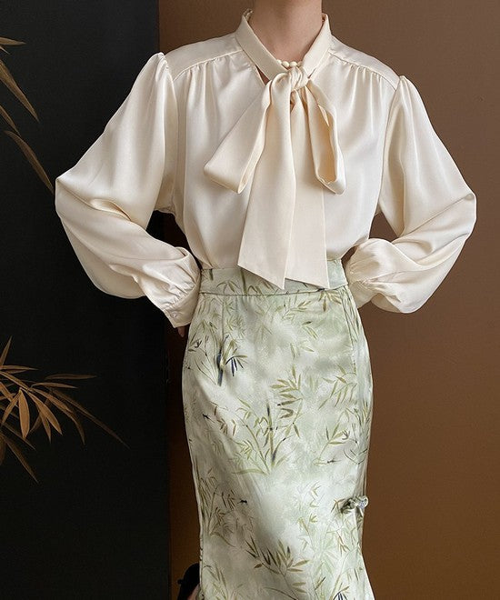 オフィスでも女性らしさを忘れたくないとき、ボウタイブラウスは最適な一枚。リボンが顔まわりを華やかに演出し、柄スカートと合わせればフェミニンで上品な印象に。きちんと感のあるアイテム同士の組み合わせなので、オフィスでも浮かずに大人らしいスタイルが完成します。