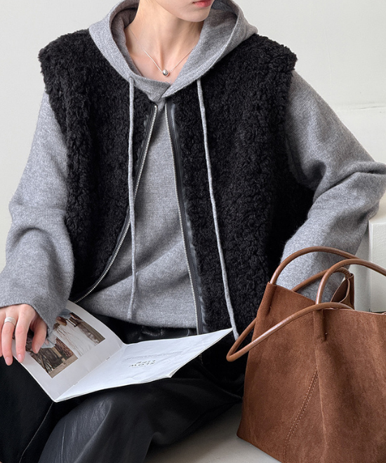 ブラックカラーのボアベスト。温かみあるふわふわ感が、寒い季節にぴったりです。パーカーの上に着て、秋冬コーデ。ネックレスを付けると、華やかさがプラスされます。
