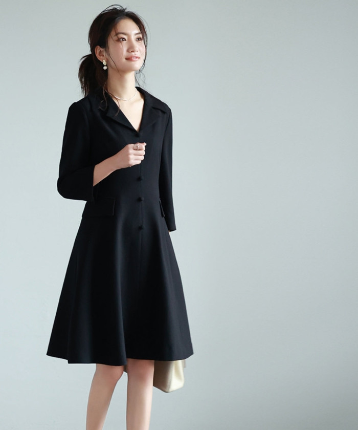 襟付きのクラシカルなテーラードワンピースは、ブラックで引き締めたひざ上丈がきちんと感を演出。スリムなシルエットで女性らしさもあり、オフィスやフォーマルなオケージョンにもぴったりです。シンプルながら上品に見える、大人の女性におすすめな一枚。