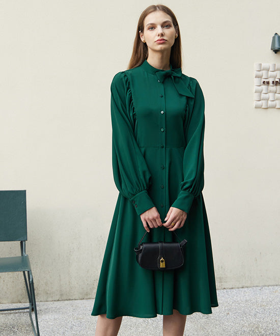 グリーンのAラインワンピースは、華やかさと上品さを同時に演出。首つまりデザインで顔まわりがすっきり見え、アクセントカラーのワンピースをブラックバッグで引き締めれば、大人のきれいめコーデが完成。特別な日のお出かけにもおすすめです。