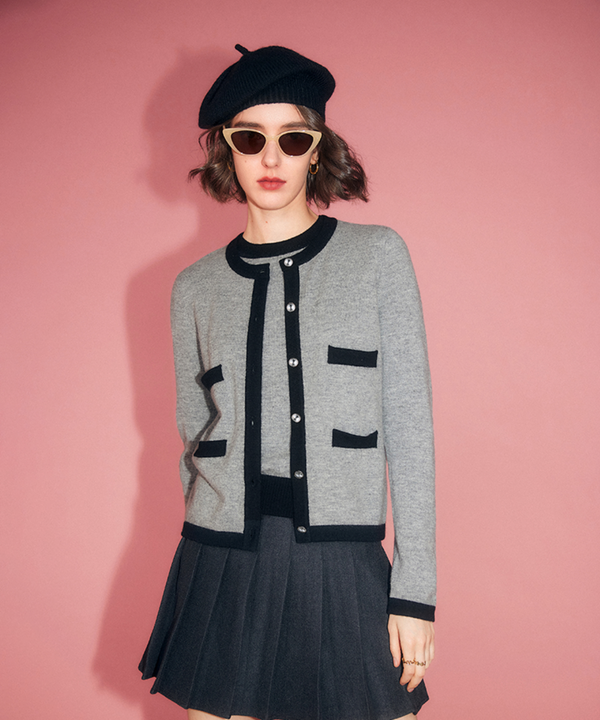 グレーを基調にした配色カーディガンにブラックを差し色として効かせることで、程よく引き締まった印象に。ブラックのミニスカートと合わせれば、カジュアルながらも大人のモード感を楽しめるスタイリングが完成します。