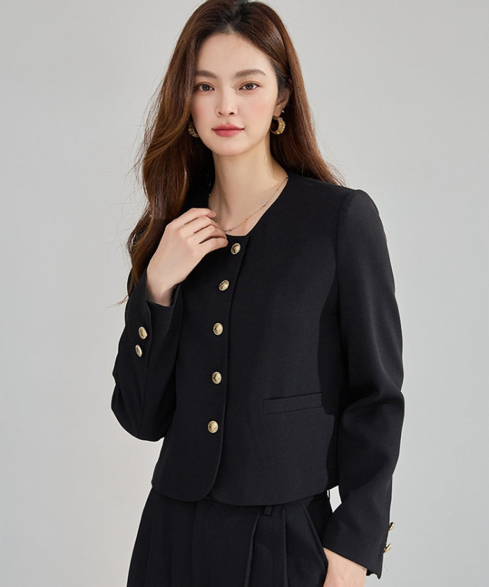 短め丈とノーカラーデザインで、上半身をすっきり見せつつ女性らしい抜け感を演出。控えめだけれど程よく存在感のあるゴールドボタンが、コーデのアクセントに。ワイドパンツやロングスカートとも相性が良く、通勤から週末ランチまでシーンを選ばずに活躍します。