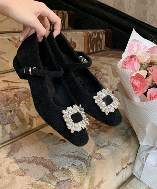 大きなビジューバックルが付いた、ローヒールのストラップシューズ。