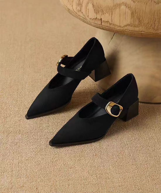 シャープなポインテッドトゥと、スクエアヒールで作る、モダンなシルエットが印象的なストラップシューズ。