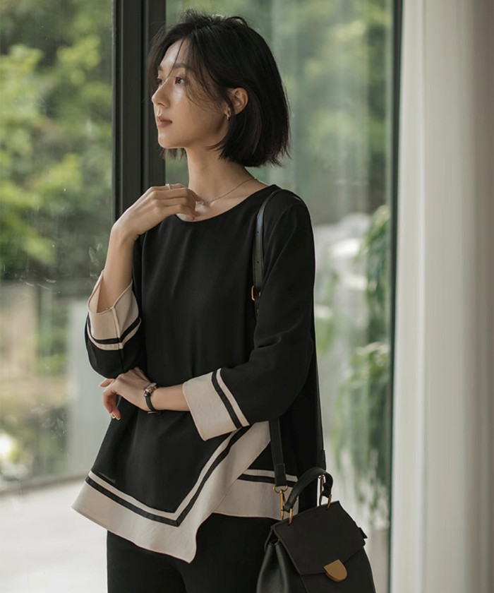 ブラックの落ち着きとエクリュラインのコントラストで、視線をすっと上半身に集める端正な印象のブラウス。ゆったりめのシルエットが気負わず着られて、身体のラインを拾いすぎないのも嬉しいポイント。スラックスで品良くまとめても、デニムでカジュアルダウンしても上品に決まる一枚です。