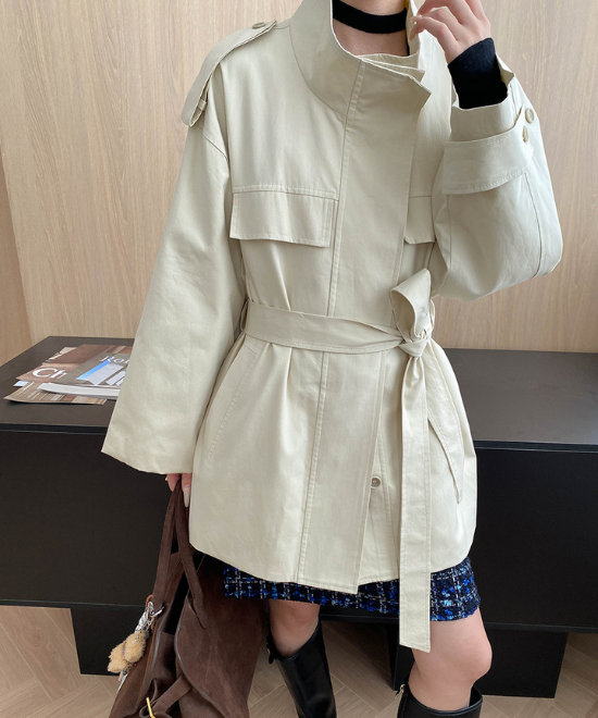 上品なトレンチシルエットをベースに、ポケットデザインなどワークジャケットのエッセンスを取り入れた一枚。クラシックすぎずカジュアルすぎない絶妙なバランスで、羽織るだけでコーデにこなれた雰囲気を演出します。スタンドカラーが顔まわりをすっきり見せ、パンツスタイルとの相性も抜群。