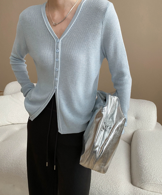 身体に沿いすぎないシルエットと、適度に開いたVネックが上品な印象を引き出してくれるカーディガン。色合いも柔らかく、重たいアウターの下に着ても“抜け感”を生む一枚です。ボタンを閉じてトップスとして着ても、羽織りにしてもサマになる万能アイテム。