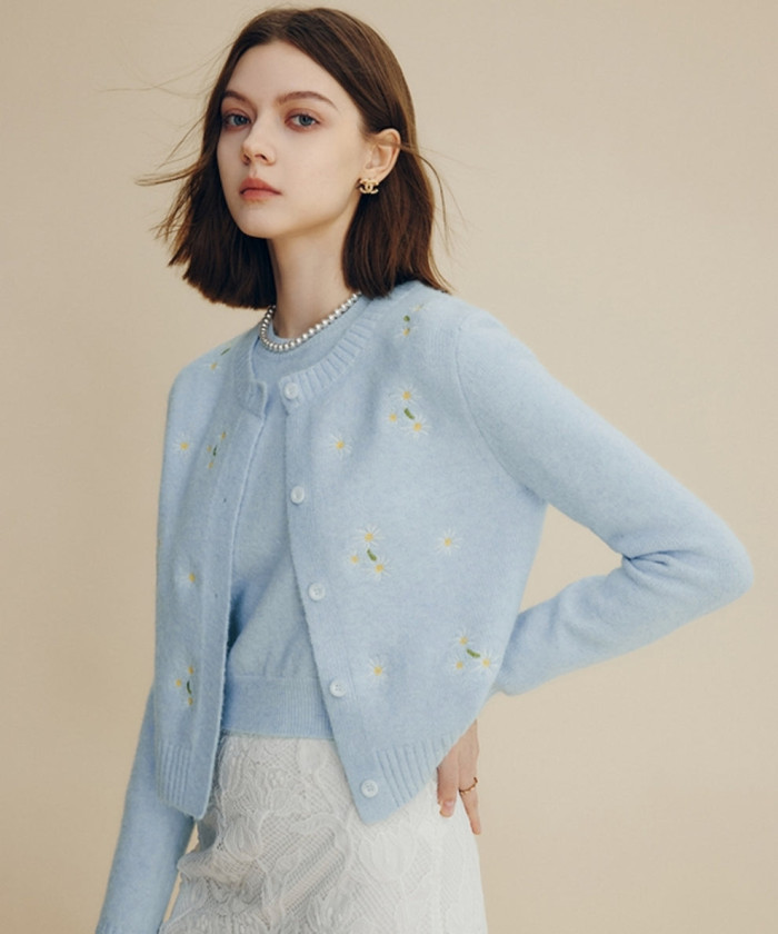 ナチュラルなニット地に施されたデイジー刺繍が、甘すぎず上品な可愛さを添えてくれる一枚。シンプルなインナーに羽織るだけでコーデが完成する存在感があり、カジュアルからきれいめまで幅広く活躍します。優しいカラーで顔まわりがパッと明るく見えるのも嬉しいポイント。
