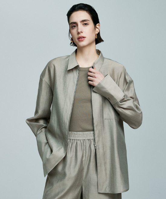 ファスナー使いのシンプルなシャツ。長めのカフスがさり気なくモード感をプラスしています。