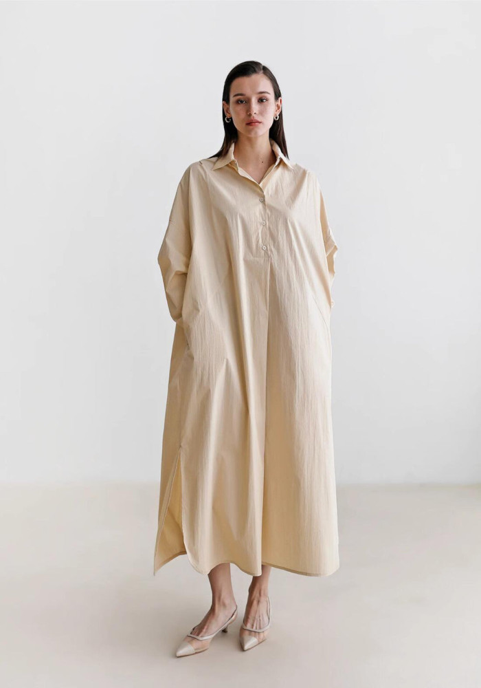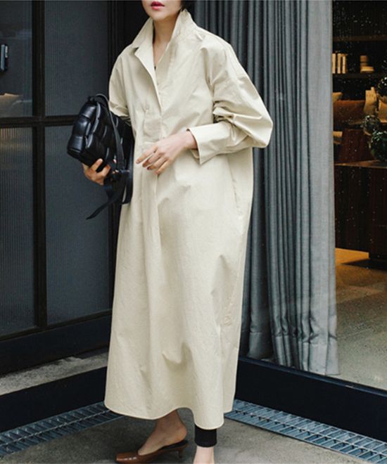 ワイドなシルエットが風を含むように揺れ、自然な抜け感をつくるロングシャツワンピース。落ち感のある素材が広がりすぎず、大人らしいまとまりのあるシルエットに整えてくれます。アウター次第で季節を問わず着まわせ、四季にやさしい表情を添えてくれる一枚です。