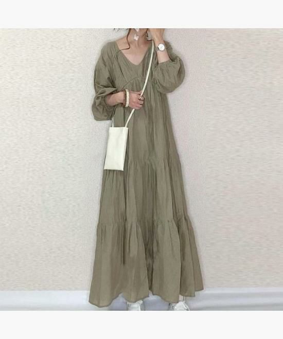 緩やかに段を重ねたティアードがほどよい華やぎを添えつつ、軽やかに揺れて優しい印象をつくるロングワンピース。Vネックが顔周りをすっきり見せ、首元の抜け感も上品です。甘すぎないシルエットなので、日々の外出に自然と馴染み、気負わず女性らしさを楽しめます。