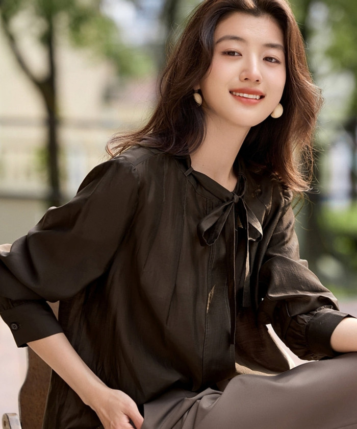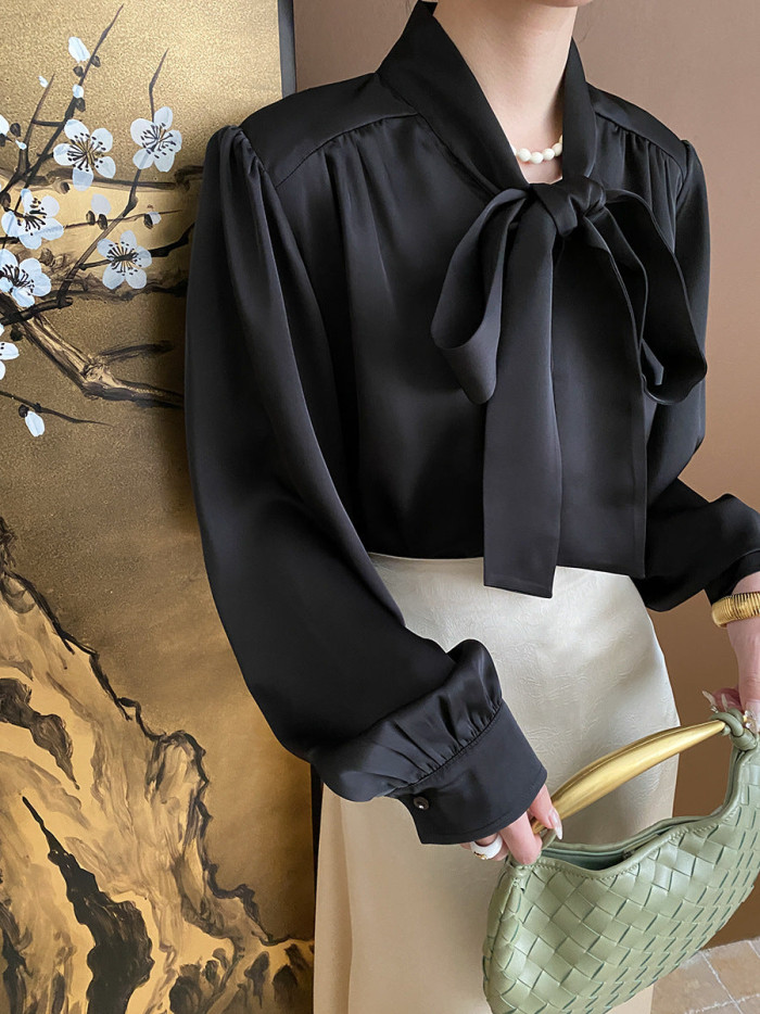 とろみ素材で軽やかに揺れるボウタイブラウス