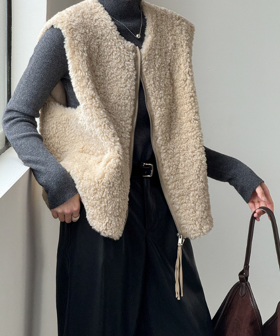 暖かさだけではなく、何か物足りないを解決してくれるベストはボア素材のもので目を惹くコーディネートに。シンプルなコーディネートに立体感が生まれたり、女性らしい可愛さを添えてくれるのはボアだからこそ。アクセサリーやバッグ、ブーツなどきれいめなアイテムと合わせると子供っぽくならずに上品な印象に。