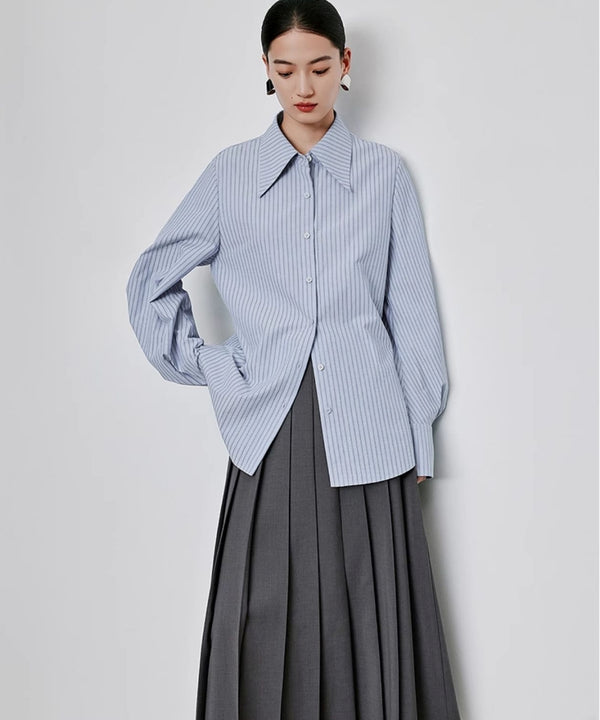 ワイドカラーとブルーのストライプが印象的なシャツは、大きめの襟が顔周りを華やかに見せてくれる一枚。グレーのボトムスと合わせれば、落ち着きつつもおしゃれなモノトーン寄りコーデが完成します。さらにニットのインナーとしても活躍する万能アイテムで、デイリーからオフィスまで着回し力抜群です。