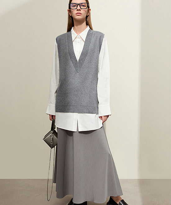 ロング丈×深Vネックのすっきり感が魅力のニットベスト。スリット入りのデザインが重たさを抑え、パンツやスカートに重ねるだけで自然とこなれた印象に整います。あくまで“重ね着前提”のベストなので、インナー次第で雰囲気を変えながら長い季節で楽しめるアイテムです。