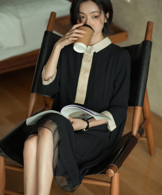 モノトーン×シャツデザインで真面目に魅せつつも、裾にレースをあしらい女性らしさも感じられるワンピース。絞りのないストンとしたシルエットに太めの前立てがかわいらしく、また素材にはシワ加工をほどこし上品に、とシンプルながらも様々な要素を盛り込んだ1枚。