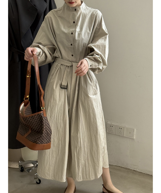 アプリコットカラーのシャツワンピース。ハイネックとボタンがポイントになっています。ヴィンテージ風がおしゃれ。