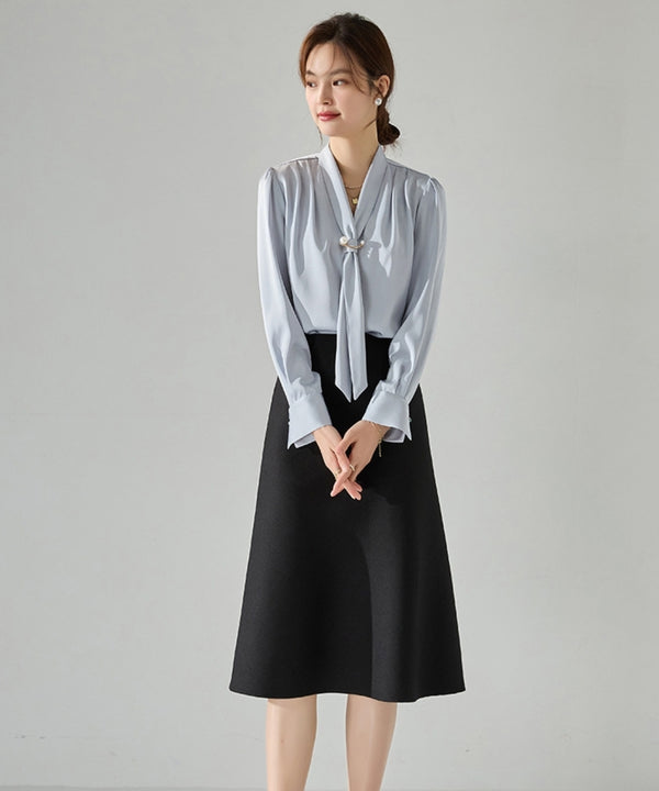 ほどよく艶めくサテン素材に、薄いブルーの柔らかな色味が清楚な印象を与えるボウタイブラウス。タイのパールボタンがさりげないアクセントとなり、甘すぎず大人の上品さを引き立ててくれます。ボトムスにはブラックのスカートを合わせることで全体がきりっと引き締まり、サテンの光沢がより美しく際立つバランスになりますね。