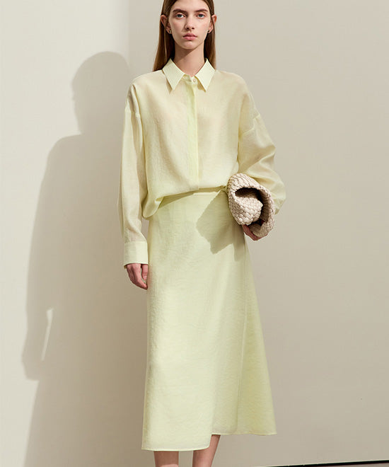 柔らかな落ち感のあるルーズシルエットとドロップショルダーが、こなれた雰囲気を漂わせるイエローのラペルシャツ。鮮やかすぎず上品な発色のイエローなら、オフィスでも取り入れやすく、顔周りを明るく見せてくれるのが魅力です。同系色のアイテムを合わせてトーンを揃えると、華やかさがありつつもまとまりのある印象に仕上がります。