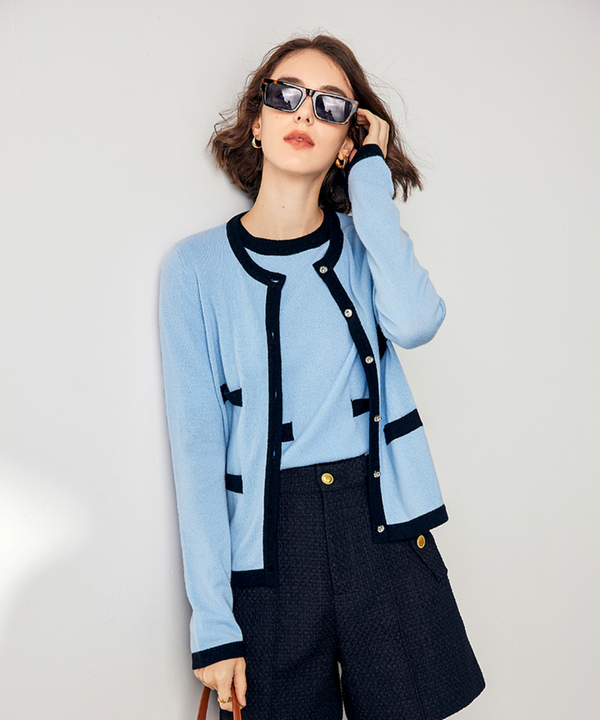 ブルーとブラックの配色ラインが印象的なバイカラーニットカーディガンは、着るだけでコーデのアクセントになる万能アイテム。ショートパンツをブラックでまとめることで全体のバランスが引き締まり、カジュアルながらもきちんと感をキープできます。程よく甘さのあるデザインながら、大人らしい落ち着いたカラー使いでオフィスやきれいめカジュアルにも対応可能。