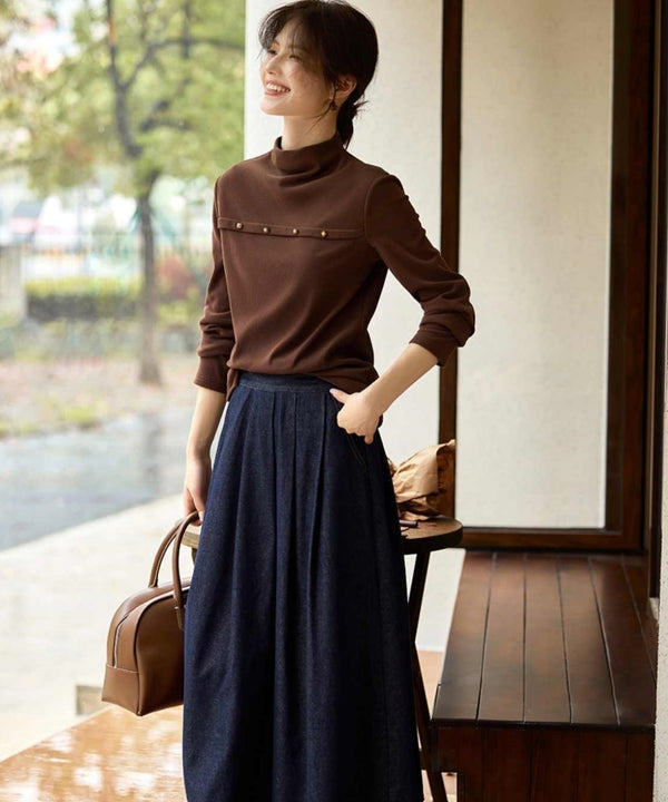 トレンド感のあるブラウンカラーが季節ムードを高めるハーフタートルネックニット。コンパクトなシルエットは着膨れせず、ボリュームのあるボトムスともバランスよく決まるのが魅力です。ショートパンツやフレアスカート、ワイドパンツなど、幅広いボトムスに合わせやすく、上下のメリハリでスタイルアップも叶います。