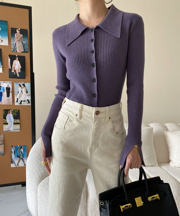 リブ素材のスリムなポロニットは体のラインに沿うので、着るだけで細見え効果バツグン。パープルのトップスに白のボトムスを合わせれば、コントラストでさらにすっきり見えます。縦のラインが強調されるリブのデザインで、シンプルながらもおしゃれに見えるバランスのいいコーデです。