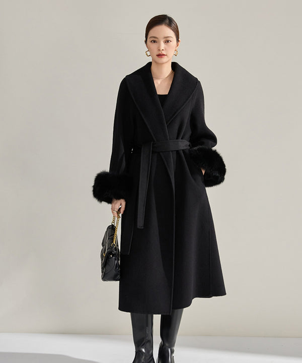 ショールカラーのウールロングコートは、袖口のファーがアクセントになりつつ、全体をオールブラックでまとめることでモード感あふれる着こなしに。足元もバッグも黒で統一すれば、シックで洗練された印象を際立たせる、冬のスタイリッシュコーデの完成です。