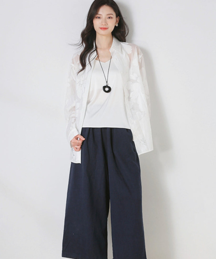 フラワーモチーフがキュートで、ホワイトの色味が爽やかな雰囲気をえんしゅつしてくれる、シアー素材の王道アイテムともいえるシアーシャツ。透け感のない厚手のニットを着こむ今、ニットの上から、またはショート丈のニットの下に着るとおしゃれでこなれた印象になるのです。透け感で軽やかさアップ。