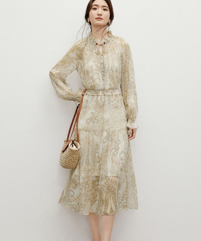 シアー素材を用いて、ティアードやフリルなどのスウィーティーな印象のディテールデザインを盛り込んだ、トレンド感満載のワンピース。ロングコートやダウンなど、抜け感の無いアイテムを着ることが増えるので、シアー感のある主役級の1枚を着用すると一気にあか抜けた印象へ早変わりするのです。