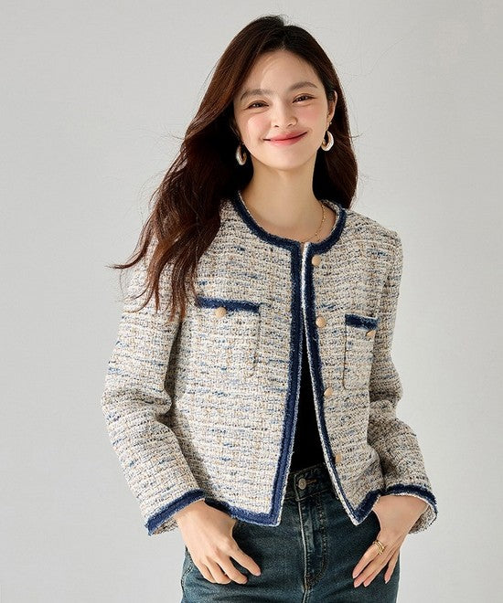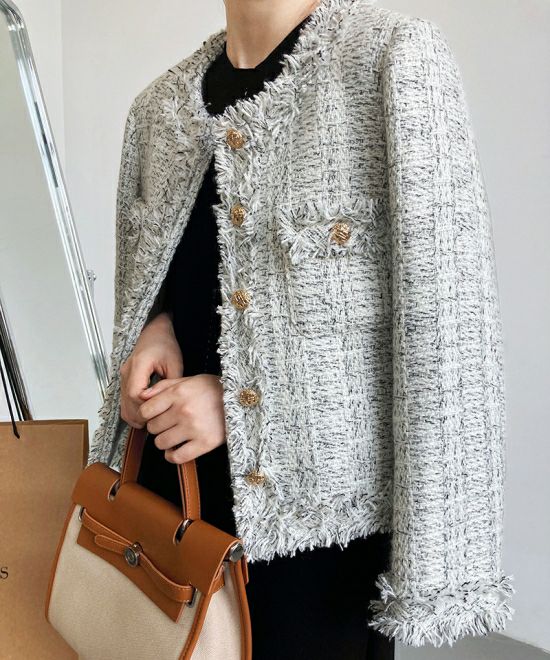 縁にあしらわれたフリンジがやさしい動きを生み、羽織るだけで大人の存在感を引き立ててくれるツイードジャケット。程よい厚みの素材がシルエットをきれいに保ち、きれいめにもカジュアルにも合わせやすいのが魅力です。普段の装いにほどよい華やぎを添えたい時に心強い一枚です。