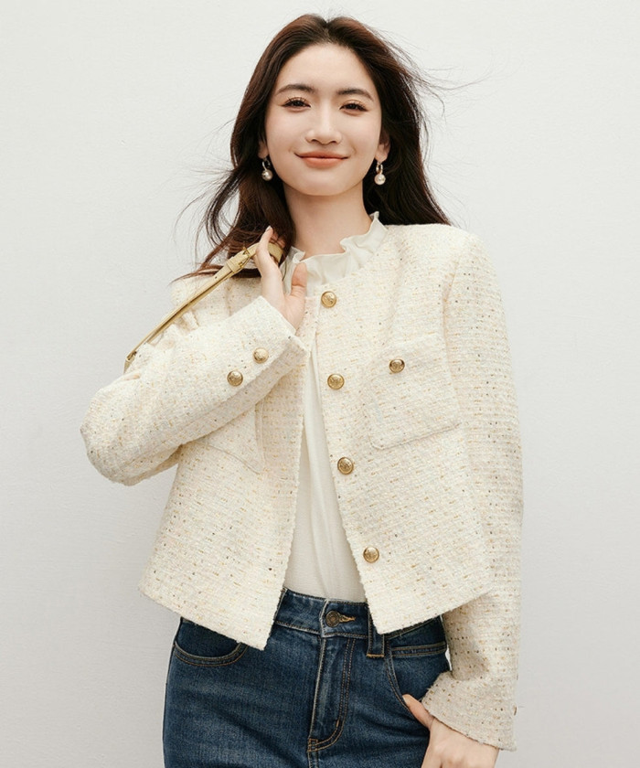 ウエスト上で軽く収まるショート丈が、コーデ全体をすっきり見せてくれるツイードジャケット。ほんのりコンパクトなシルエットが女性らしさを漂わせ、ワンピースにもパンツにも合わせやすい一枚です。凹凸のあるツイード素材が華やぎを添え、定番コーデを自然にアップデートしてくれます。