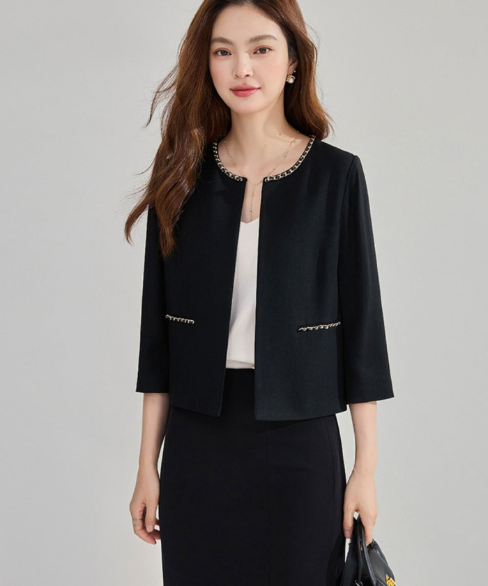 さりげなく添えられたメタルチェーンが、ノーカラーデザインの上品さをぐっと引き立てるジャケット。七分袖がすっきりとした印象をつくり、アクセサリーとの相性も抜群です。堅くなりすぎずに華やかさを楽しめるシルエットで、特別な日にも普段のきれいめにも活躍します。