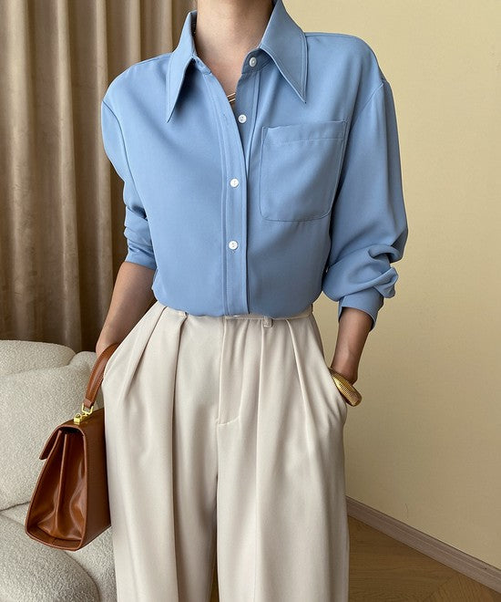 やわらかなドレープが美しいブルーの襟付きシャツは、シンプルながらも上品な印象を与える一枚。ホワイトのボトムスを合わせることで清潔感を演出し、通勤スタイルにぴったりのきちんと感をキープ。さらに、ブラウンのバッグを合わせることで温かみと落ち着きをプラスしてくれます。