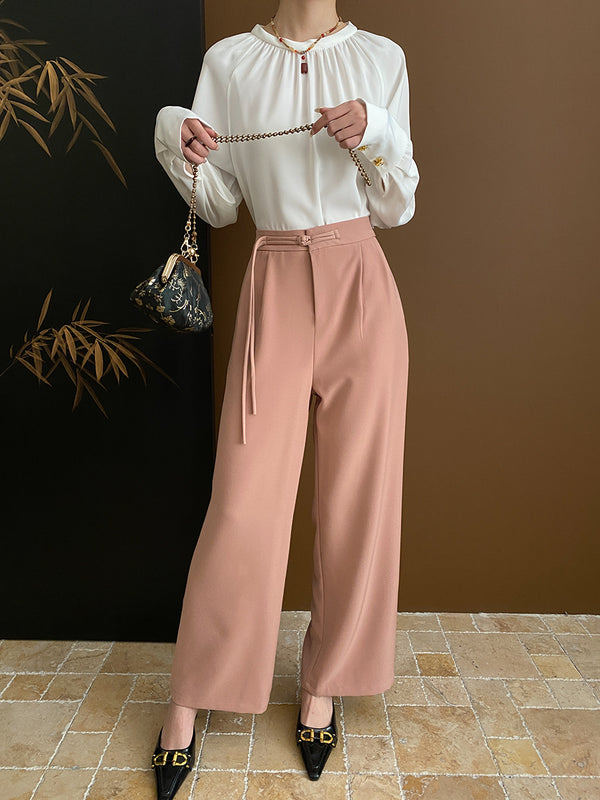首元に施された繊細なプリーツが上品なブラウスは、シンプルながら大人の女性らしい華やかさを演出。ラウンドネックが柔らかい印象を与え、きちんと感を保ちながらも親しみやすさをプラスします。ピンクのパンツを合わせれば、優しげで大人可愛いきれいめコーデが完成。