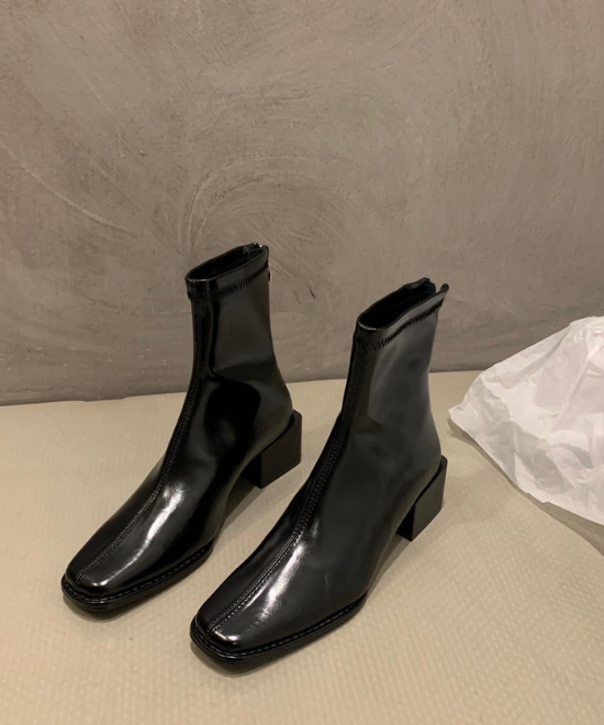 光沢のあるポリウレタンレザーのスクエアトゥブーツは