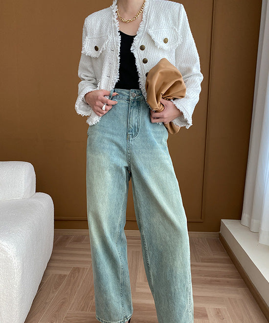 顔まわりを明るく見せるノーカラーツイードジャケットは、フリンジのディテールがさりげない華やかさをプラス。きちんと感のあるジャケットも、デニムパンツを合わせれば程よくカジュアルダウンでき、オフィス後の外出や週末スタイルにも活躍します。シンプルながらも上品さを兼ね備えているので、デイリーに取り入れやすい万能アイテムです。