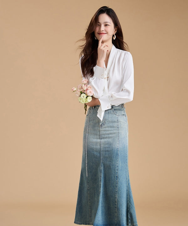 艶のあるサテン素材と上品なパールボタンが魅力のボウタイブラウスは、顔まわりを明るく華やかに見せる一枚。シンプルながらも女性らしいきれいめデザインで、オフィスからデイリーまで幅広く活躍します。デニムのマーメイドスカートを合わせれば、上品さを保ちつつ程よくカジュアルダウンでき、メリハリのあるスタイリングに。