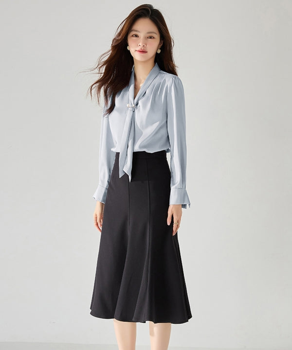 サテン素材とパールボタンが上品なライトブルーのボウタイブラウスは、爽やかで清潔感のある印象を与える一枚。首元がすっきり見えるデコルテラインで女性らしさを引き立てつつ、甘すぎないデザインが大人にぴったり。ブラックのロングスカートを合わせれば、メリハリ感と爽やかさを両立したきれいめスタイルに。