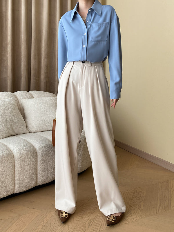 柔らかなドレープが上品なブルーのシャツは、シンプルながら爽やかさと好感度を兼ね備えた一枚。ホワイトのパンツを合わせることで、清潔感のある明るい印象を演出できます。きちんと感のある襟付きデザインはオフィススタイルにも最適で、顔まわりをすっきりと見せつつ、大人の女性らしい上品な雰囲気をプラスしてくれます。