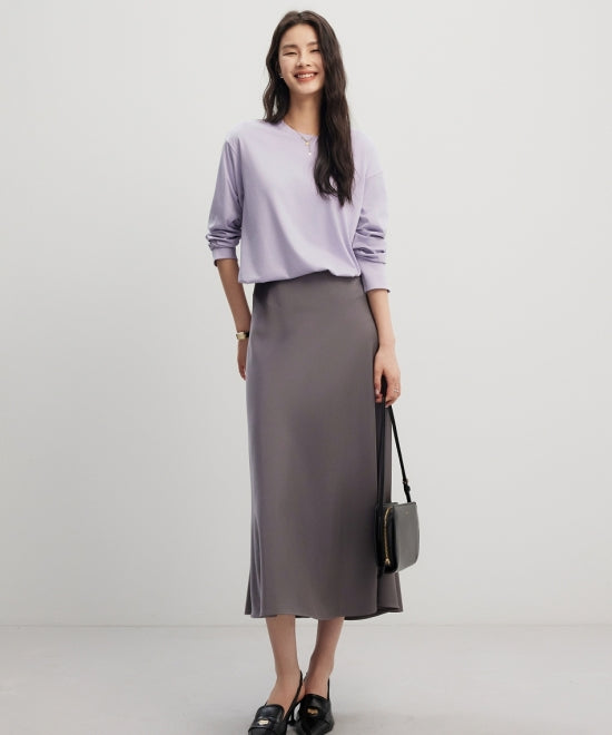やわらかなコットン素材とラウンドネックが特徴のカットソーは、シンプルながら爽やかさと華やかさを兼ね備えた一枚。顔まわりをぱっと明るく見せ、着るだけで好印象を与えられます。程よく落ち着いたパープルカラーは普段使いからちょっとしたお出かけまで、毎日着回せる大人カジュアルの定番アイテムです。