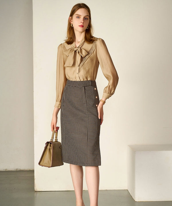 首元のボウタイとピンタックが上品なコーヒーカラーのブラウスは、秋冬のコーデに温かみと華やかさをプラスする一枚。リボンタイをアクセントにすることで、シンプルながらおしゃれ感のある印象に仕上がります。チェックスカートを合わせれば季節感も演出でき、オフィスからデイリーまで幅広く活躍。