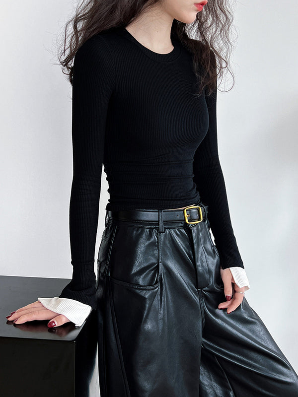 コンパクトなシルエットのニットは、リブの縦ラインと女性らしいフォルムで上品な印象に。袖口のホワイト切り替えがさりげないアクセントになり、シンプルながら存在感があります。ブラックのレザーパンツを合わせることで辛口要素をプラスし、大人の甘辛バランスを実現。