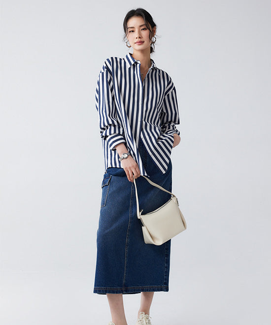 フレンチテイストのストライプが爽やかなネイビーのルーズシャツは、ほどよい抜け感でカジュアルに着こなせる一枚。デニムスカートと合わせればラフさと女性らしさのバランスが絶妙で、スニーカーとも相性抜群。シンプルながらもこなれ感のある、大人のデイリースタイルが完成します。