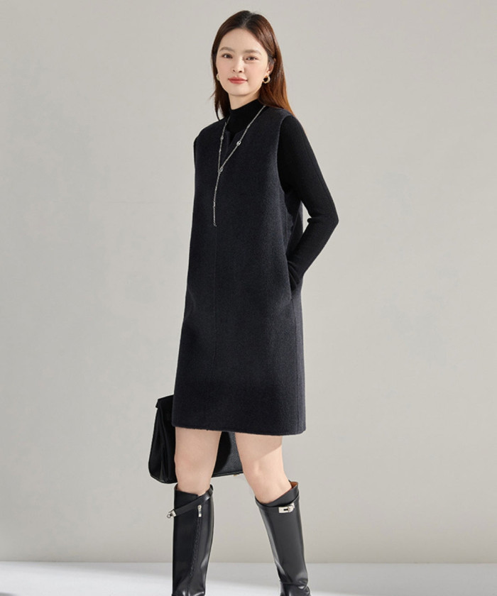 ロングブーツを履きたい時にうってつけのミニ丈ワンピース。短めの丈に苦手意識を持つ大人世代も多いけれど、シンプルなベストタイプ、なおかつ大人っぽいダークグレーなら着やすいですね。ウエストを曖昧にしてくれるボックス型のシルエットで体型カバーも。
