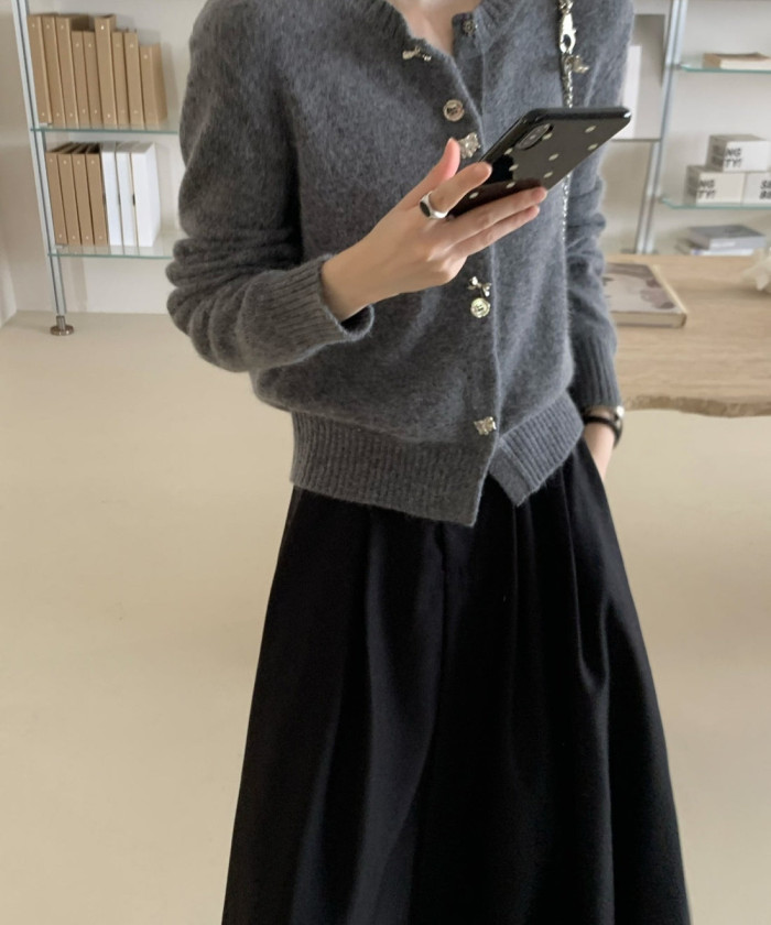 フィットし過ぎずルーズ過ぎず程よいサイズ感が魅力の定番カーディガンも、ボタンをビジューにすることで途端に今っぽく。ボリューミーなワイドパンツやレザージャケットなど、個性派アイテムも上品にまとめます。もちろんきれいめコーデやコンサバにも。