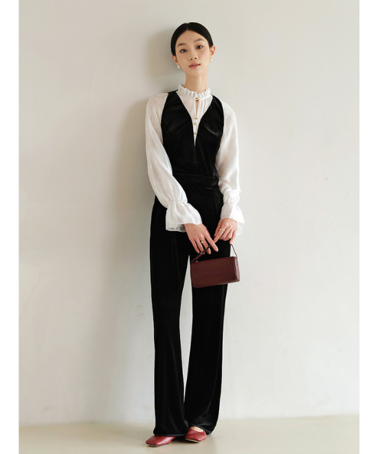 ベルベット素材のスタイリッシュなジャンプスーツ。ジャカードのシアーなブラウスとレイヤードしているように見える、フェイクデザインです。