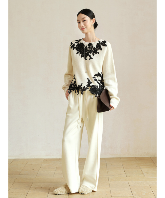ホワイトのニットにブラックのモチーフレースでドラマチックな印象のニットトップス。