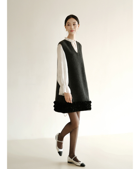 キーネックのシャープさ、裾を飾る小さくても存在感あるフリル、立体的なシルエット、ブラックの濃淡など、すべてが融合した大人可愛いデザインです。