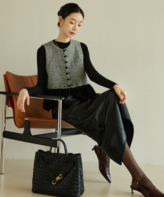 グレーカラーのツイードベスト。保温性や保湿性に優れたアイテムです。ベルベット生地のプリーツがアクセント。ブラックコーデと組み合わせると、グレーベストが主役になります。